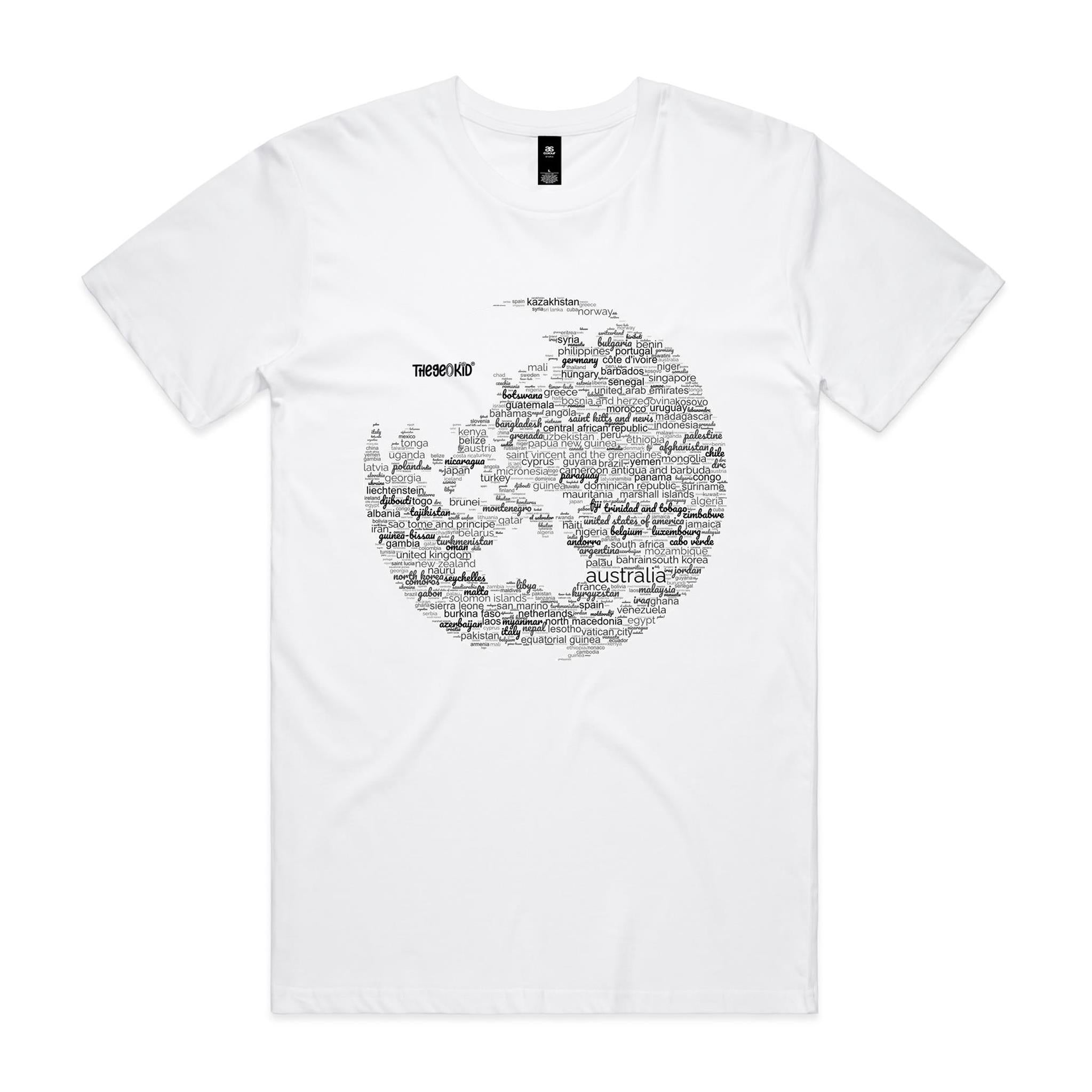 The Nations Monochrome Tee captures the essence of exploration and unity. Featuring a detailed word-cloud globe made from the 197 nations of the world, the design places Australia and South-East Asia front and centre. See if you can find all 197 countries. Its refined monochrome palette pairs effortlessly with any look — a staple for travellers and dreamers alike.