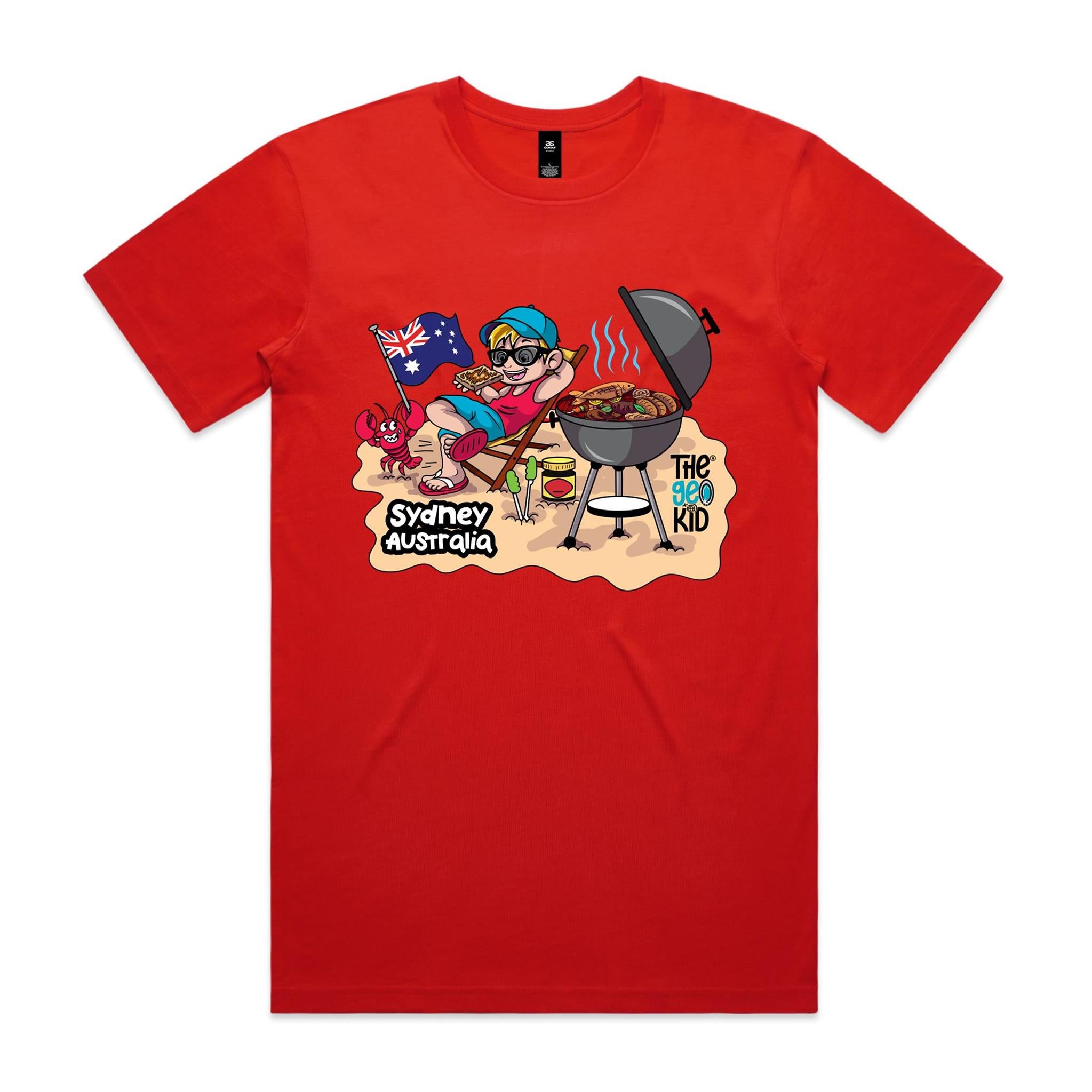 Fire up the barbie and soak up the Aussie sunshine with our Sydney Beach BBQ T-Shirt, part of our deliciously fun Tasty Travels collection. Inspired by the laid-back spirit of Sydney, this design features our Geo kicking back in a deckchair with sunnies on, beside a sizzling BBQ stacked with fresh seafood, sausages, and steaks — a classic Sydney tradition loved by locals.