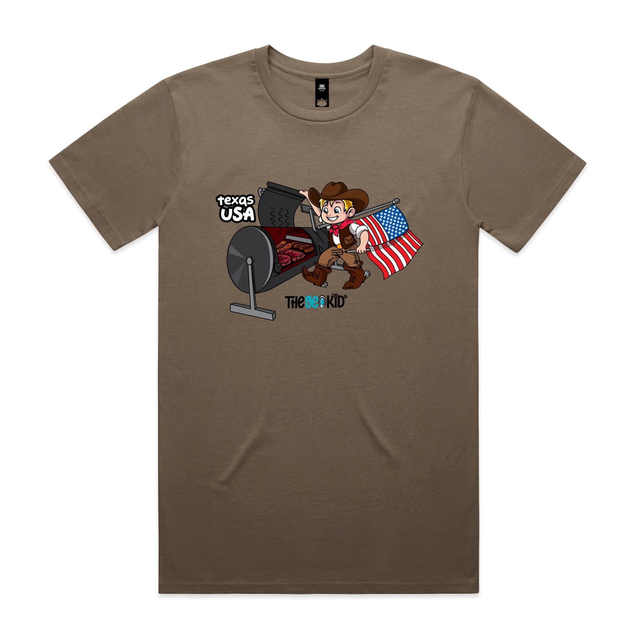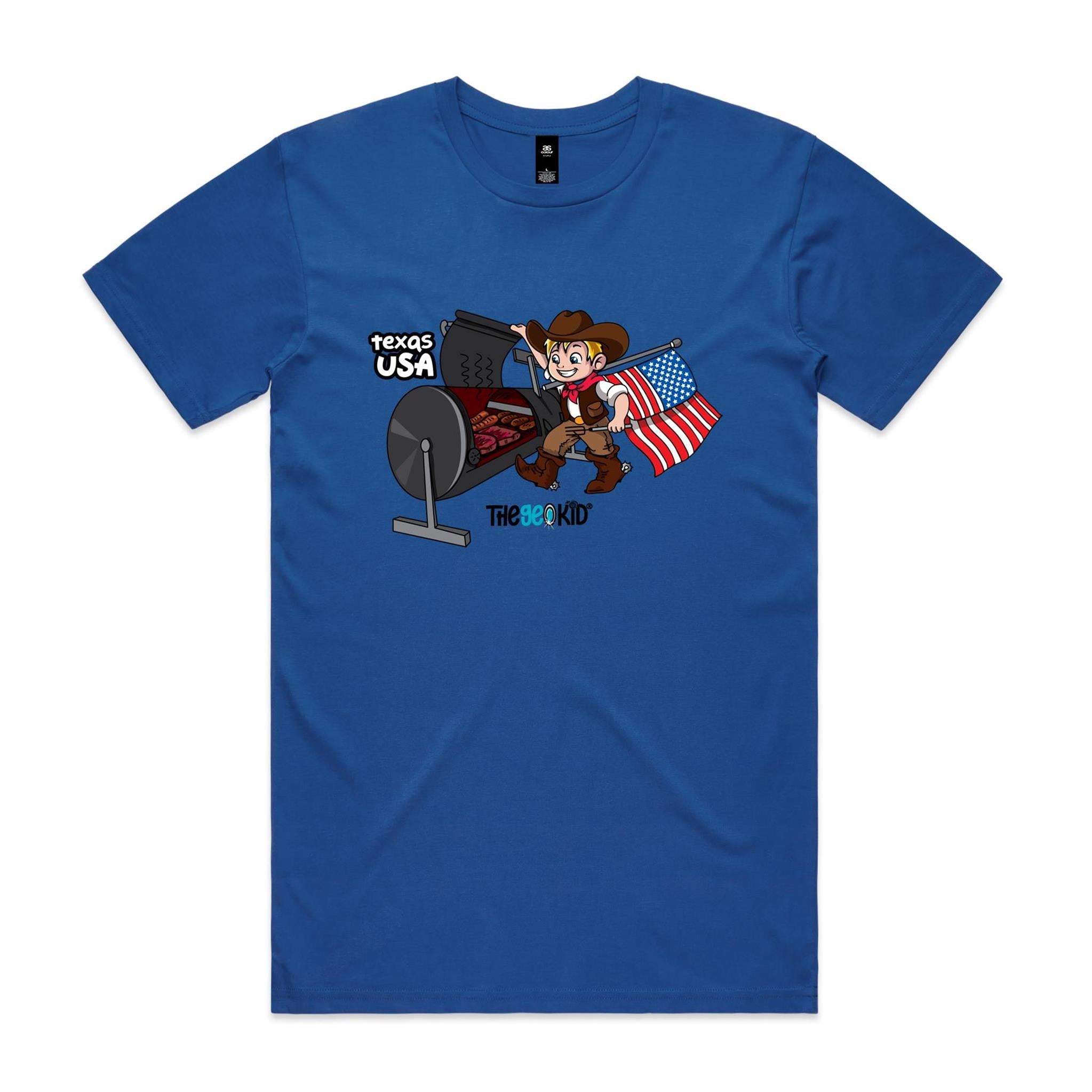 Fire up your style with our Texas BBQ T-Shirt, a tribute to the legendary smokehouses of the Lone Star State. Inspired by our visit to the iconic Terry Black’s Barbecue in Dallas Texas, this design features Geo proudly standing by a traditional smoker oven — surrounded by the mouthwatering magic of slow-cooked brisket, ribs, and BBQ beef.