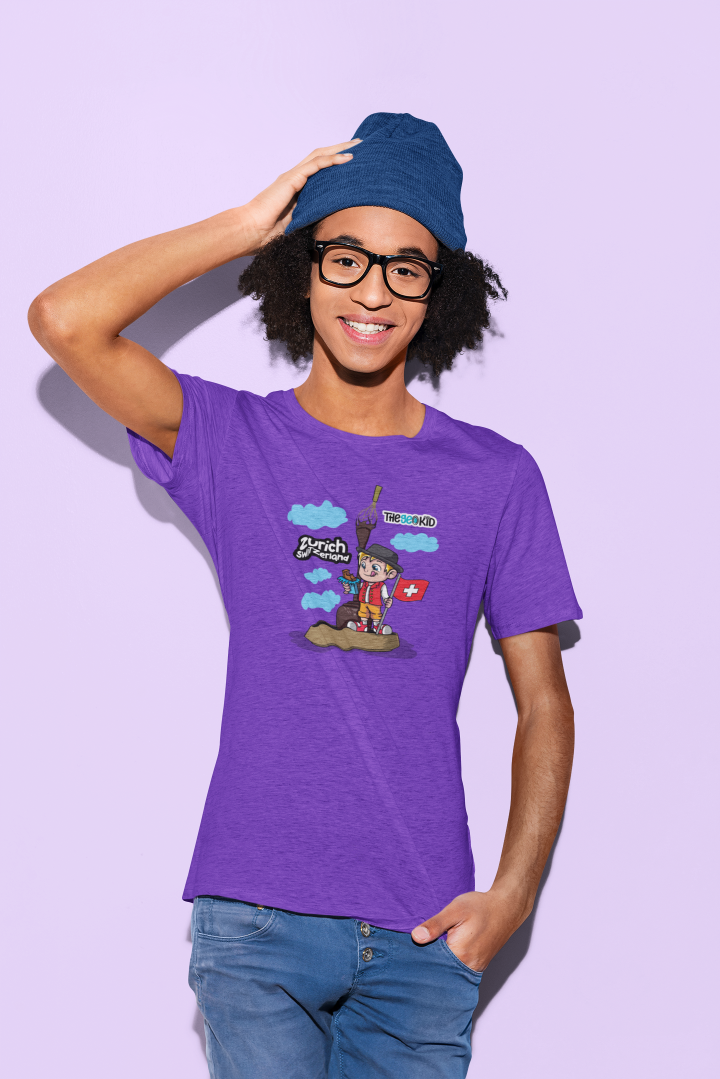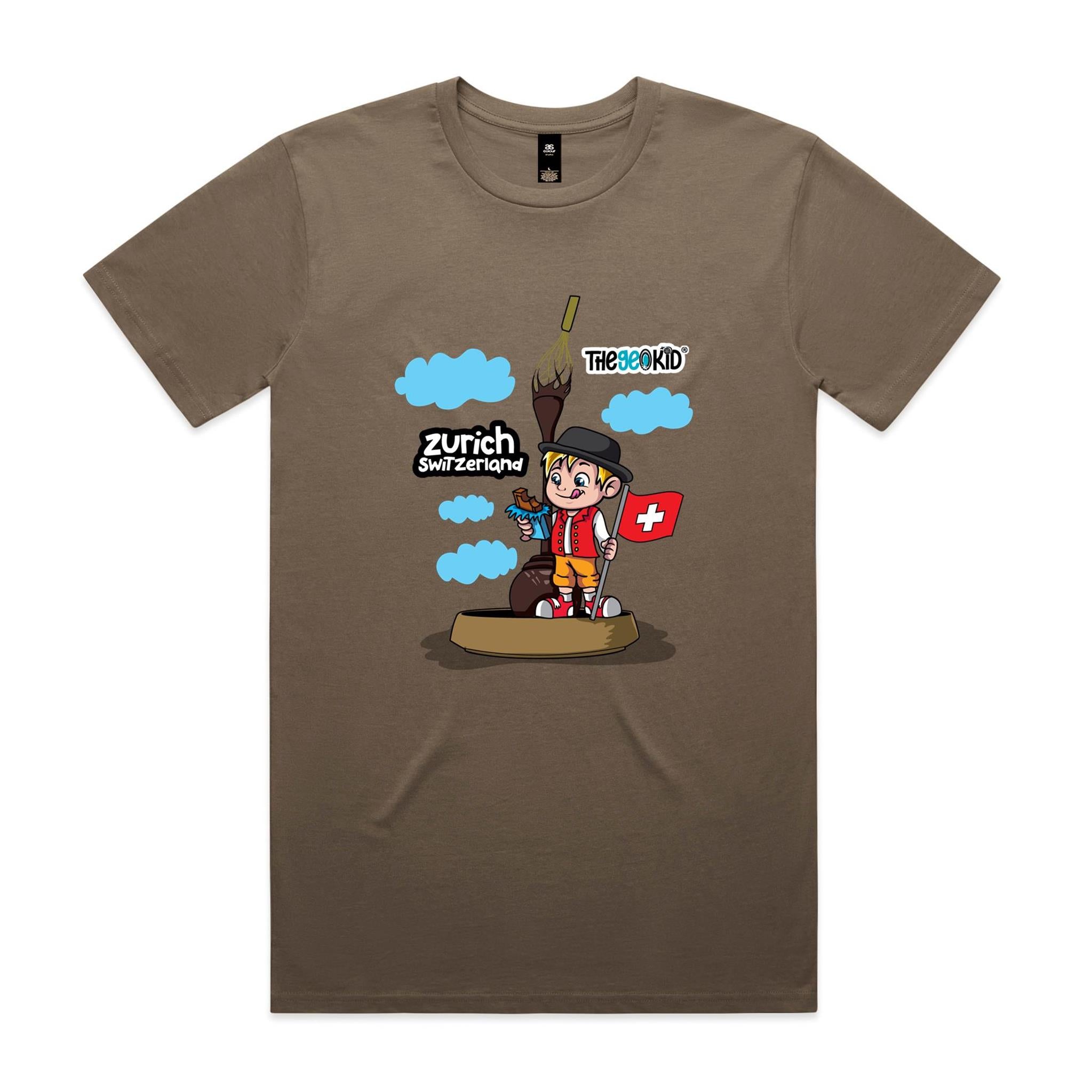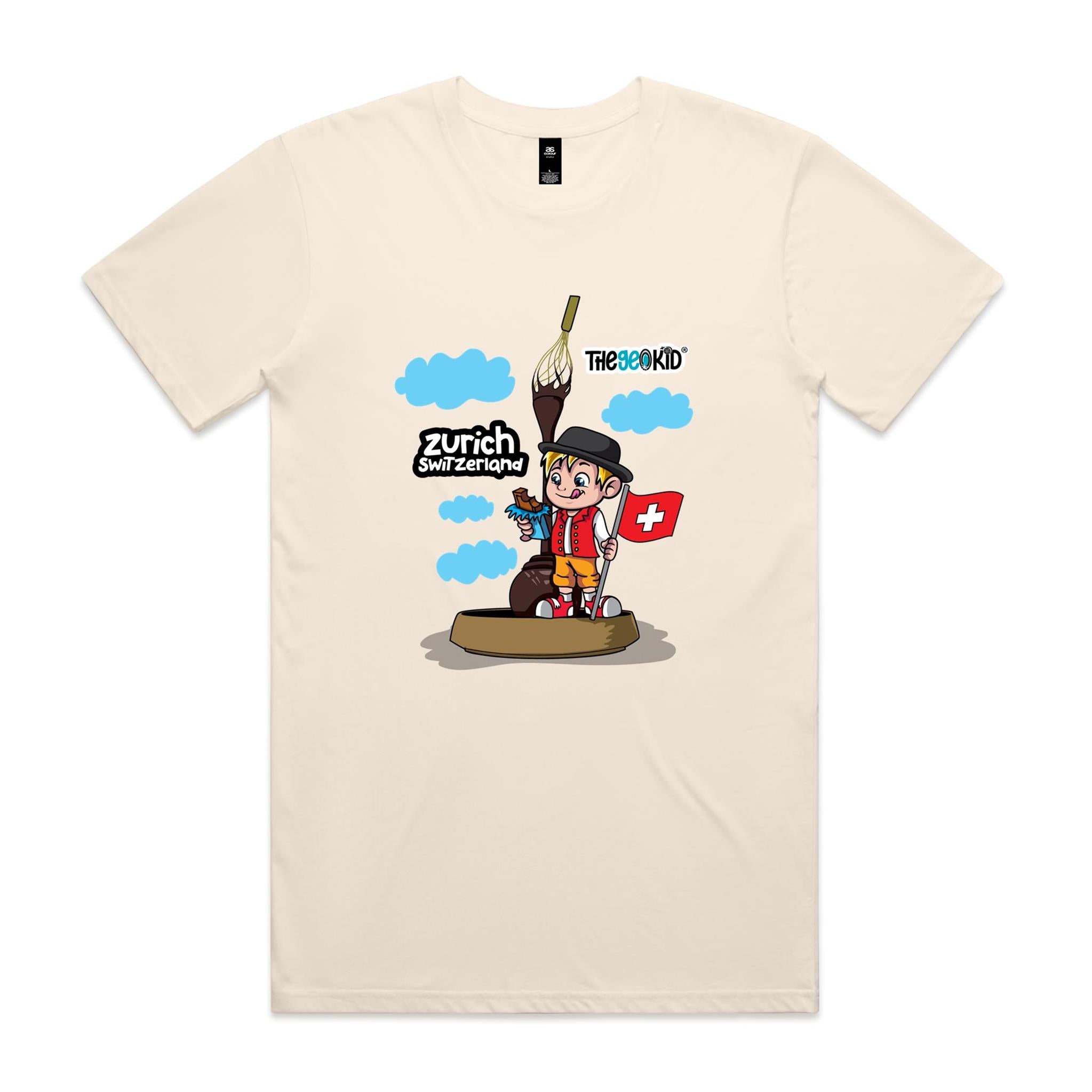 Step into a world of rich cocoa, creamy textures, and irresistible Swiss flavours with our Zurich, Switzerland T-Shirt, part of the Tasty Travels collection. Inspired by our visit to the Lindt Home of Chocolate, this design features Geo standing beside the iconic giant whisk statue and flowing chocolate fountain – a tribute to the city that made chocolate a worldwide obsession.