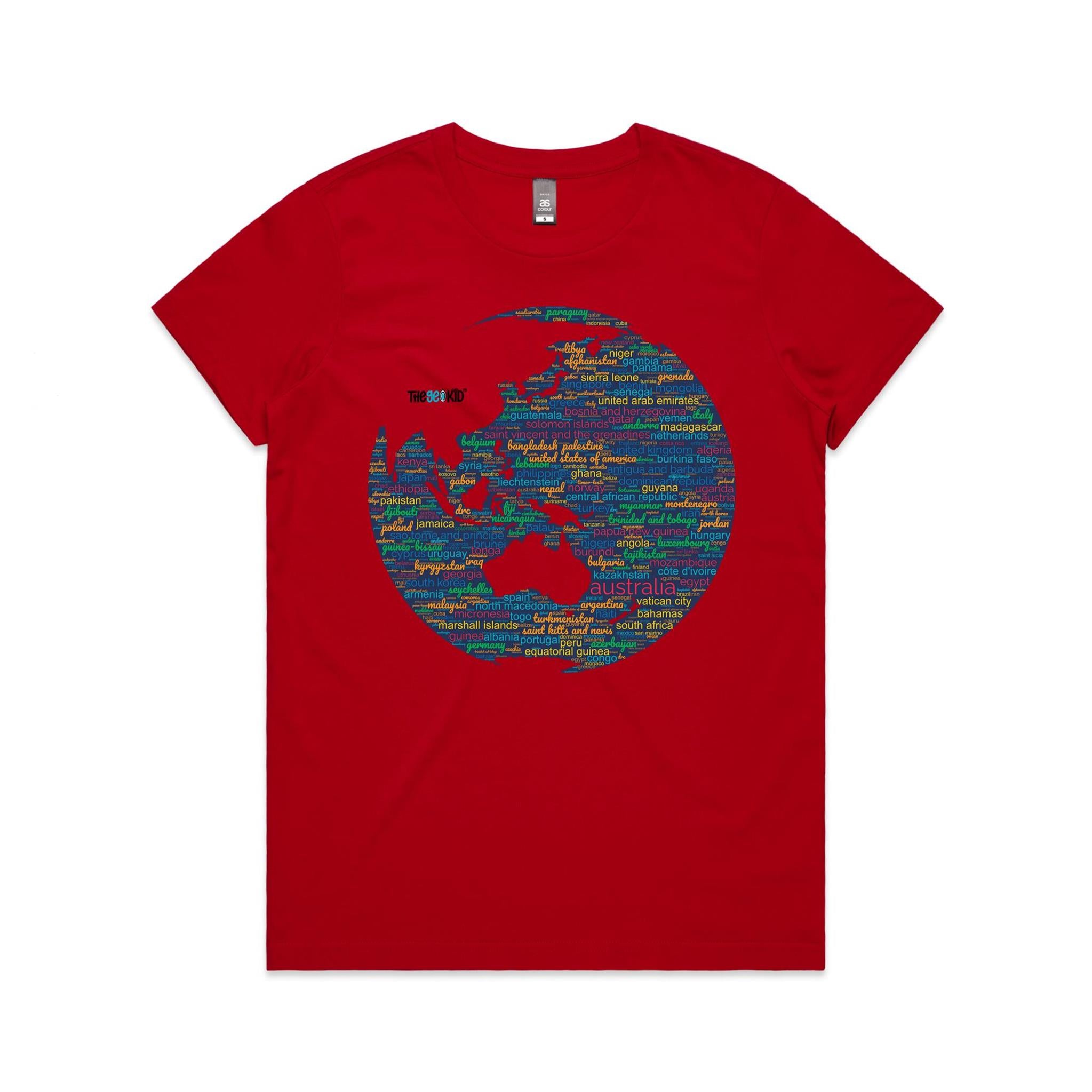 The Nations: Vivid Colour Tee celebrates the beauty of our shared planet through colour and culture. The design features a dazzling globe word cloud formed from the names of 197 countries, each printed in vivid shades of red, yellow, green, blue, and orange — representing the diversity that makes our world extraordinary.