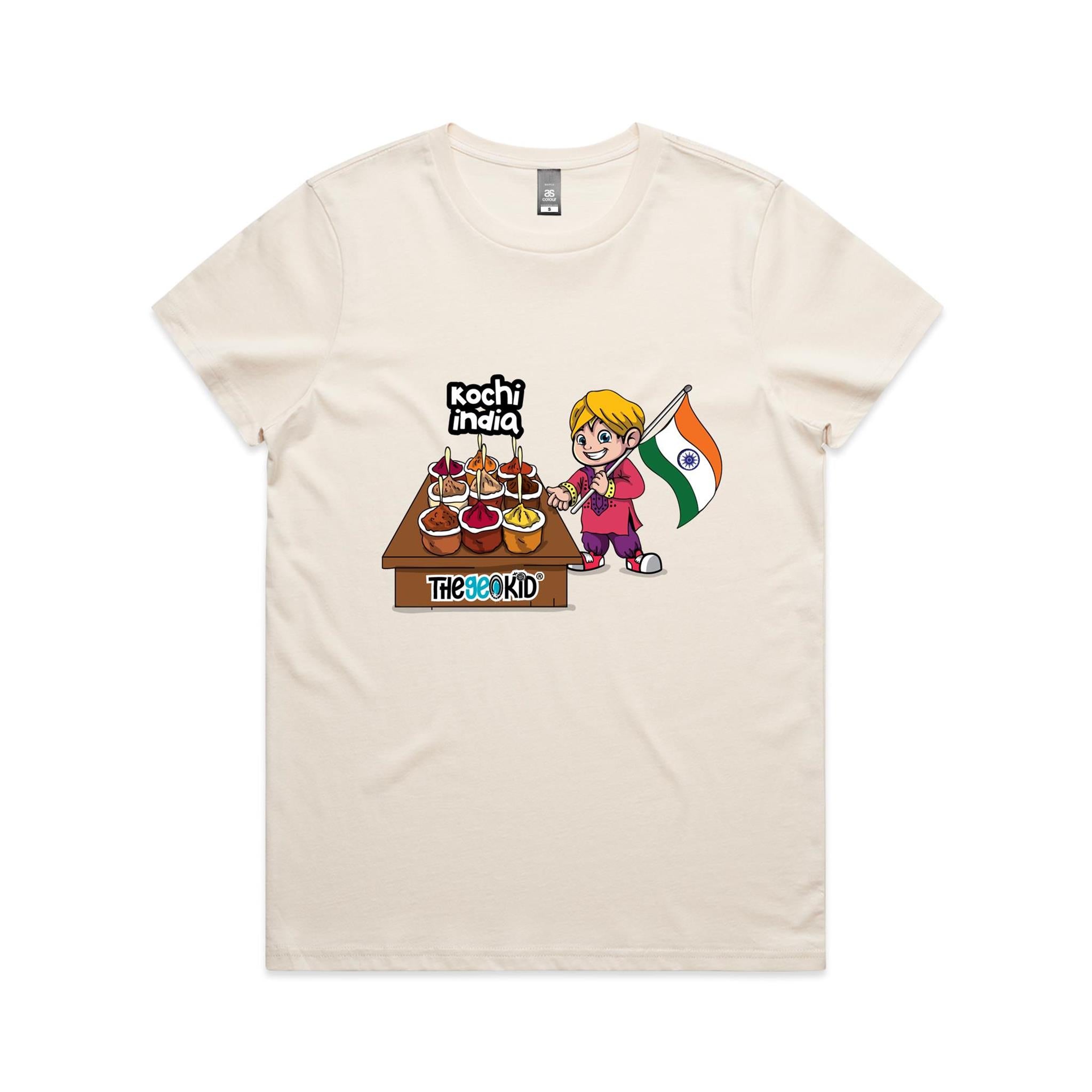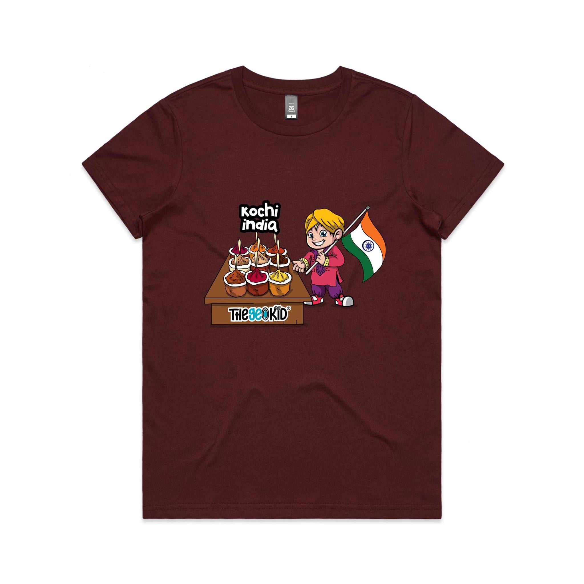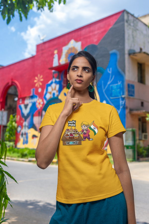 Celebrate the rich colours and aromas of India with our Kochi Spice Market T-Shirt, designed especially for women who love cultural discovery and culinary adventures. This vibrant tee features our adorable mascot amidst Kochi’s world-famous spice stalls – a perfect blend of tradition, taste, and travel.