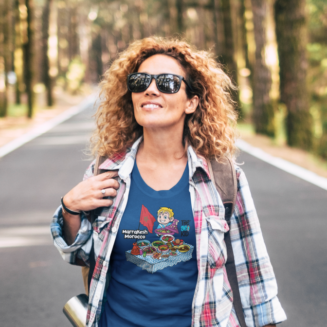 Indulge in the colours and flavours of Morocco with our Marrakesh Tasty Travels T-Shirt, designed for women who savour cultural experiences. This design showcases our mascot at a table full of traditional Moroccan dishes – from bubbling tagines to spicy curries – evoking the sights, scents, and tastes of the souks and food stalls of Marrakesh.